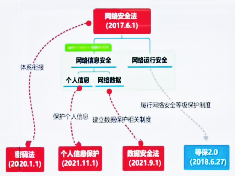 我國2017年6月1日起施行《網絡安全法》,這是我國第一部全面規(guī)范網絡空間安全管理方面問題的基礎性法律,主要涉及保護公民個人信息、嚴厲打擊網絡詐騙、以法律形式明確“網絡實名制”等重點事項;2021年9月1日起施行《數據安全法》,標志我國在數據安全領域有法可依,為各行業(yè)數據安全提供監(jiān)管依據;2021年11月1日起施行《個人信息保護法》,嚴禁“大數據殺熟”、防止“過度采集”、保護個人敏感信息……