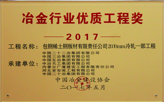 2017年度全国冶金行业优质工程奖-包钢稀土钢板材有限责任公司2030mm冷轧一部工程