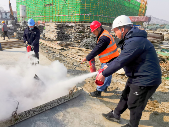 隨后,項目組織開展消防應急演練,演練場景設置為電焊工進行鋼筋焊接作業時,因大風天氣導致下落焊渣被刮到防水材料堆放處引發火災。現場巡查人員發現火情后立即上報項目應急救援領導小組,領導小組第一時間啟動應急預案,各參演小組聞令而動、迅速集結,充分利用消防培訓中學到的技能,對火情進行正確判斷,在確保自身安全的前提下,采取有效措施進行緊急撲救,在火災初期及時撲滅明火。