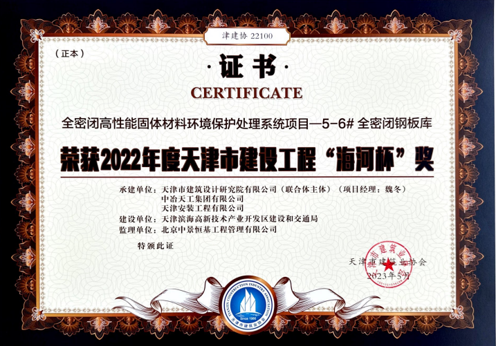 2022年度天津市建设工程“海河杯”奖—全密闭高性能固体材料环境保护处理系统项目