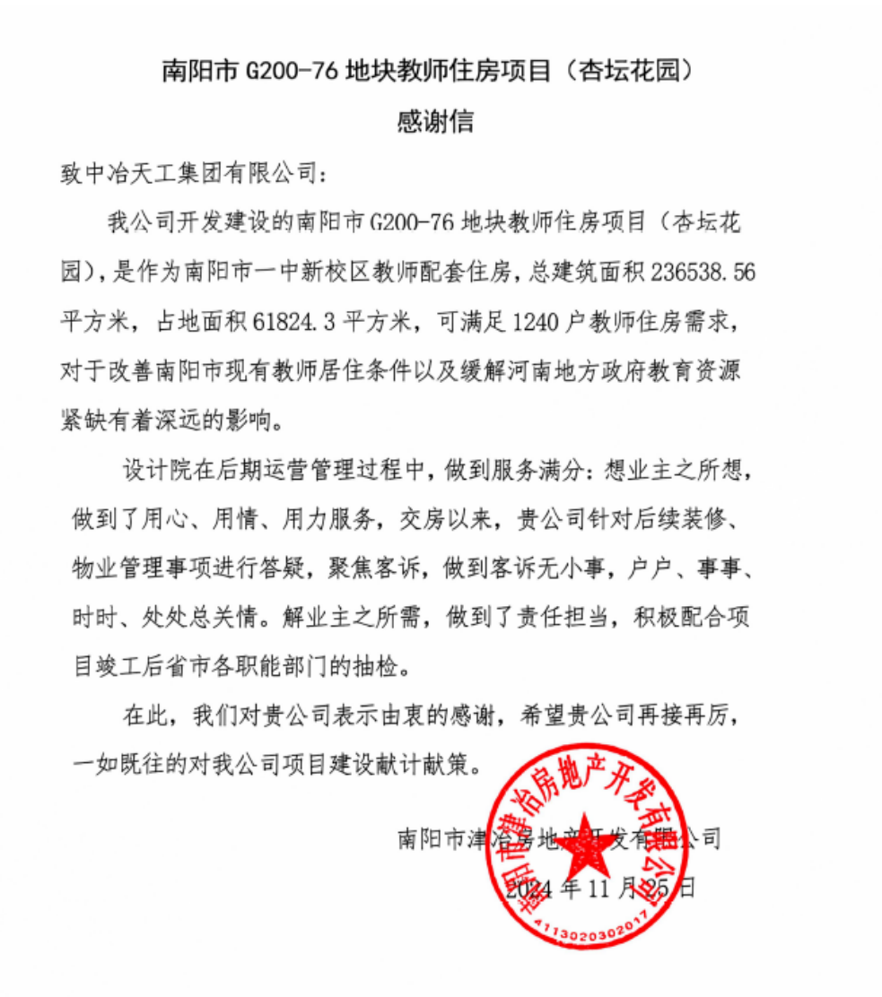 近日,工程技術(shù)總院南陽(yáng)市G200-76地塊教師住房項(xiàng)目收到業(yè)主單位南陽(yáng)市津冶房地產(chǎn)開(kāi)發(fā)有限公司向中冶天工發(fā)來(lái)的感謝信。信中表示,中冶天工設(shè)計(jì)團(tuán)隊(duì)在后期運(yùn)營(yíng)管理過(guò)程中,用心、用情、用力服務(wù),想業(yè)主之所想,做到服務(wù)滿分。