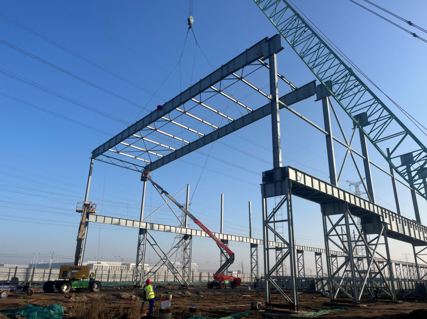 公司施工范圍內(nèi)廠房鋼結構工程總量7500噸,其中屋面系統(tǒng)占3000噸,大跨度屋面梁安裝工程量大,安裝難度高,過程中與土建施工交叉作業(yè)點較為密集。為確保按時間節(jié)點高質量完成廠房鋼結構安裝施工任務,項目團隊統(tǒng)籌規(guī)劃、上下協(xié)同,結合實際反復測算調(diào)整施工組織方案,優(yōu)化作業(yè)流程、細化施工任務、明確時間節(jié)點、合理調(diào)配資源,還針對大跨度屋面梁安裝及時組織專家論證,在技術層面確保安裝方案的安全性和可行性,持之以恒強化安全質量過程管理,有序推進項目建設跑出“加速度”,如期實現(xiàn)屋面梁首吊重要安裝節(jié)點。
