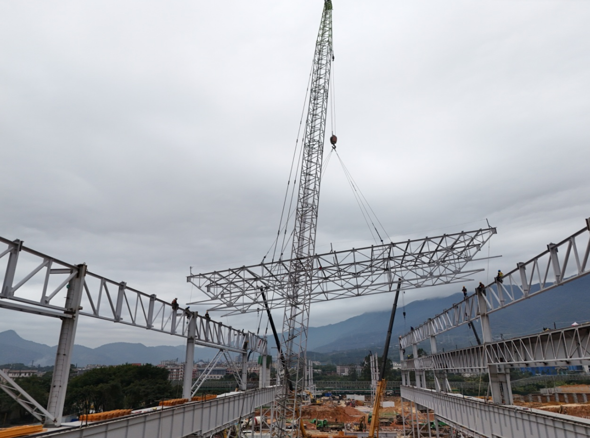 此次吊裝的屋面梁重約15噸,是該工程首個橫跨梁,也是工程正式進入鋼結構主體施工階段的關鍵節點。為保證現場吊裝安全、順利進行,項目團隊堅持目標不動搖、標準不降低、工作不松勁,根據工程特點和施工圖紙,在鋼構件吊裝路線、吊裝方法、吊車起吊能力等方面提前謀劃,召開專題施工會,全面做好鋼柱吊裝前各項準備工作。同時,主動積極與總包、業主及監理單位就施工方案細節進行深入溝通交流,加強現場作業人員技術交底和安全培訓,優化機具人力配置,彰顯了中冶天工卓越的項目執行能力和高效的管理水平。