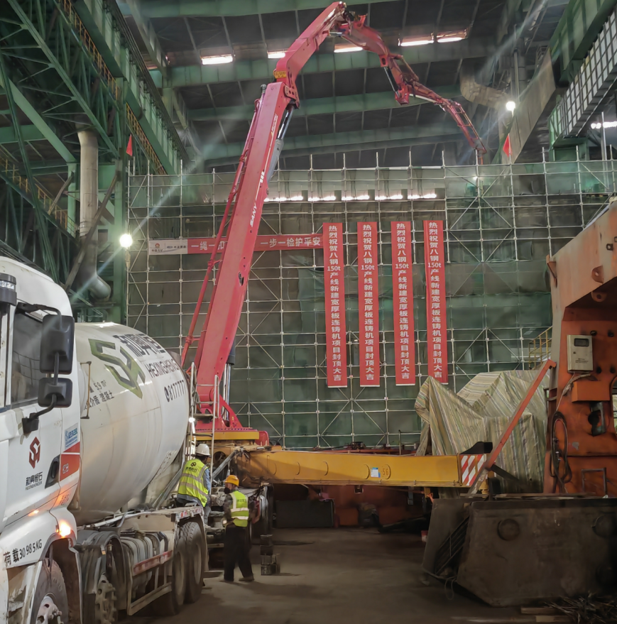 項目主要承擔1臺單流 2300mm 寬厚板坯連鑄機及配套公輔設施的施工、安裝與調試任務。其中,14.395m 平臺作為項目主線的核心節點,自啟動以來便受到業主、監理、總包的高度關注。該平臺施工難度顯著,面臨多重考驗:項目位于生產區內,施工場地狹小且區域分散,生產與施工協調難度大;施工過程涉及土建、電儀、設備安裝、管網鋪設等多個專業,各工序交叉作業頻繁,施工銜接效率要求高;大包回轉臺、扇形段等關鍵部位的設備安裝精度要求高,同時還需同步推進附屬建筑、介質管網等配套工程。為確保進度,項目團隊采用“見縫插針”式施工組織,強化各專業協同調度,在保障安全與質量的前提下,最終提前完成封頂目標。