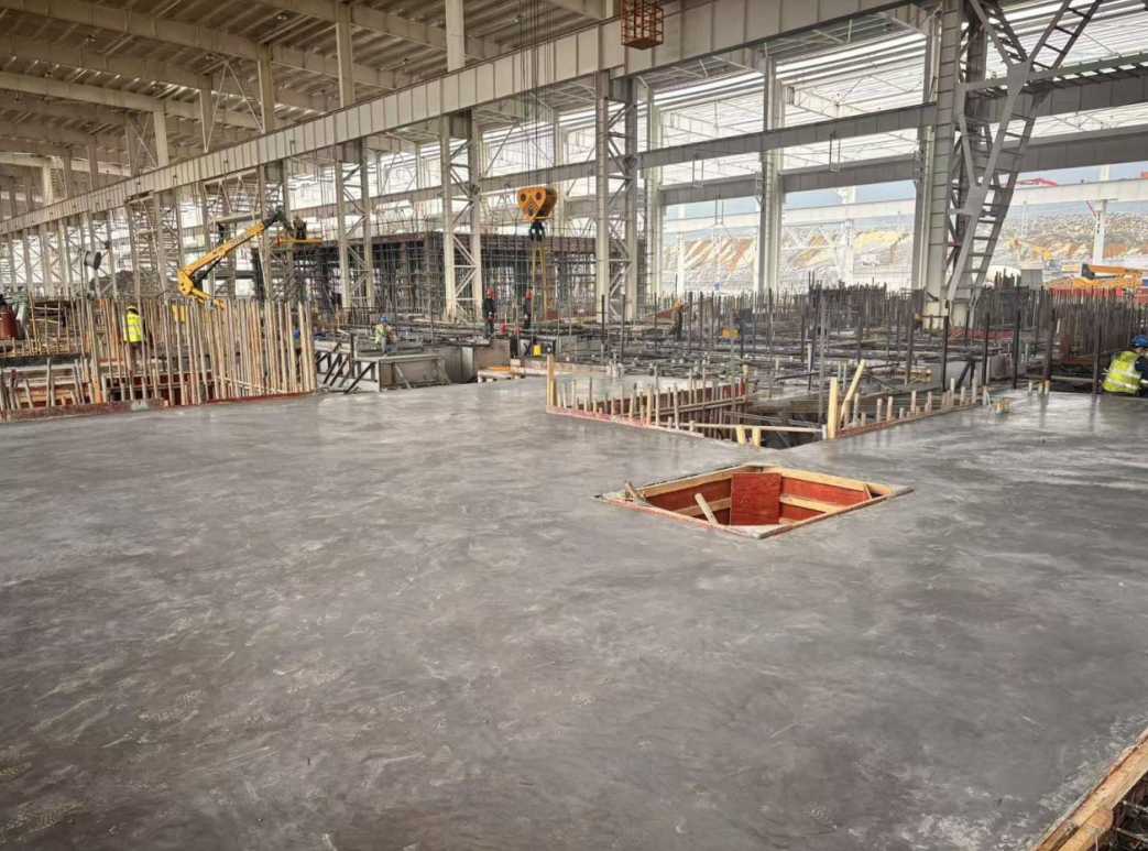 該項(xiàng)目為重慶市2025年重大項(xiàng)目之一,主要建設(shè)熱軋冷軋聯(lián)合車間、智能物流裝置等。本次澆筑工程混凝土總體積達(dá)4100立方米,最厚處達(dá)5米,施工強(qiáng)度與質(zhì)量管控要求極高。為保障作業(yè)順利推進(jìn),項(xiàng)目部提前謀劃、精密部署,牽頭組織業(yè)主、監(jiān)理、分包及混凝土供應(yīng)商等多方單位召開技術(shù)交底會(huì)議,全鏈條梳理供應(yīng)保障、過程控制、澆筑工藝、路徑規(guī)劃等關(guān)鍵工作,制定詳實(shí)管控方案與完備應(yīng)急預(yù)案。