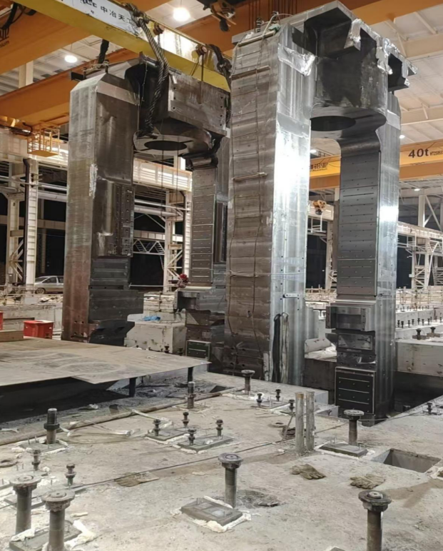 自牌坊運(yùn)抵施工現(xiàn)場(chǎng)以來(lái),項(xiàng)目全體參建人員晝夜奮戰(zhàn)、高效協(xié)同,卸車(chē)、清洗、定位、吊裝等各道工序環(huán)環(huán)相扣、無(wú)縫銜接。在專(zhuān)業(yè)技術(shù)團(tuán)隊(duì)的精準(zhǔn)操控下,兩臺(tái)行車(chē)同步發(fā)力、平穩(wěn)起吊,經(jīng)過(guò)數(shù)小時(shí)的緊張作業(yè),R2粗軋機(jī)牌坊精準(zhǔn)落位,實(shí)現(xiàn)一次吊裝圓滿成功。