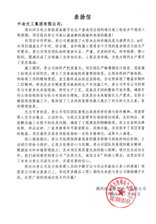 近日,中原公司浙江湖州四方電力智能裝備數(shù)字化生產(chǎn)基地項目收到了業(yè)主發(fā)來的表揚信。信中對項目團隊秉持專業(yè)嚴謹、務(wù)實擔(dān)當(dāng)?shù)墓ぷ髯黠L(fēng),以精益求精的匠心圓滿完成施工任務(wù),并推動項目平穩(wěn)進入維保階段表達了真摯的感謝。